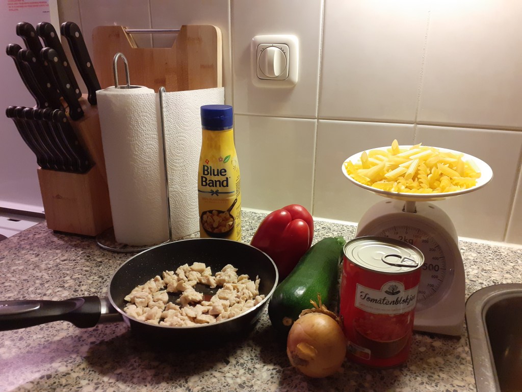 De werkelijkheid is dat die kip in dat pannetje… de dag ervoor al was gebraden. En, in de koelkast goed gehouden, nu alsnog z’n lekkere plaats in kon nemen in een gezond gerecht. Want koken valt bij mij af wanneer het niet zo goed gaat. Omdat ik dan alleen door het koken al gegeten en gedronken heb en dat is niet zo gezond. En omdat de puf me ontbreekt. Gelukkig kan koken ook in stapjes. De aanhouder wint ook hier, zelfs wanneer het een raar vervolg verhaaltje wordt. De smaak is er uiteindelijk niet minder om. Trots daarentegen kan wel wat verzuren hierdoor. En dat merkte ik dan wel weer. Alsof mijn waarde ligt in de maaltijd die ik wel of niet kook. Maar ach… dat is toch iets waar ik geen ruimte aan wil laten. Eenvoudige eerlijkheid lijkt misschien wat kwetsbaarder, maar ik val niet meer door de mand met schone schijn daardoor. En dat is dan weer fijn een stuk meer ontspannen voor mij.
